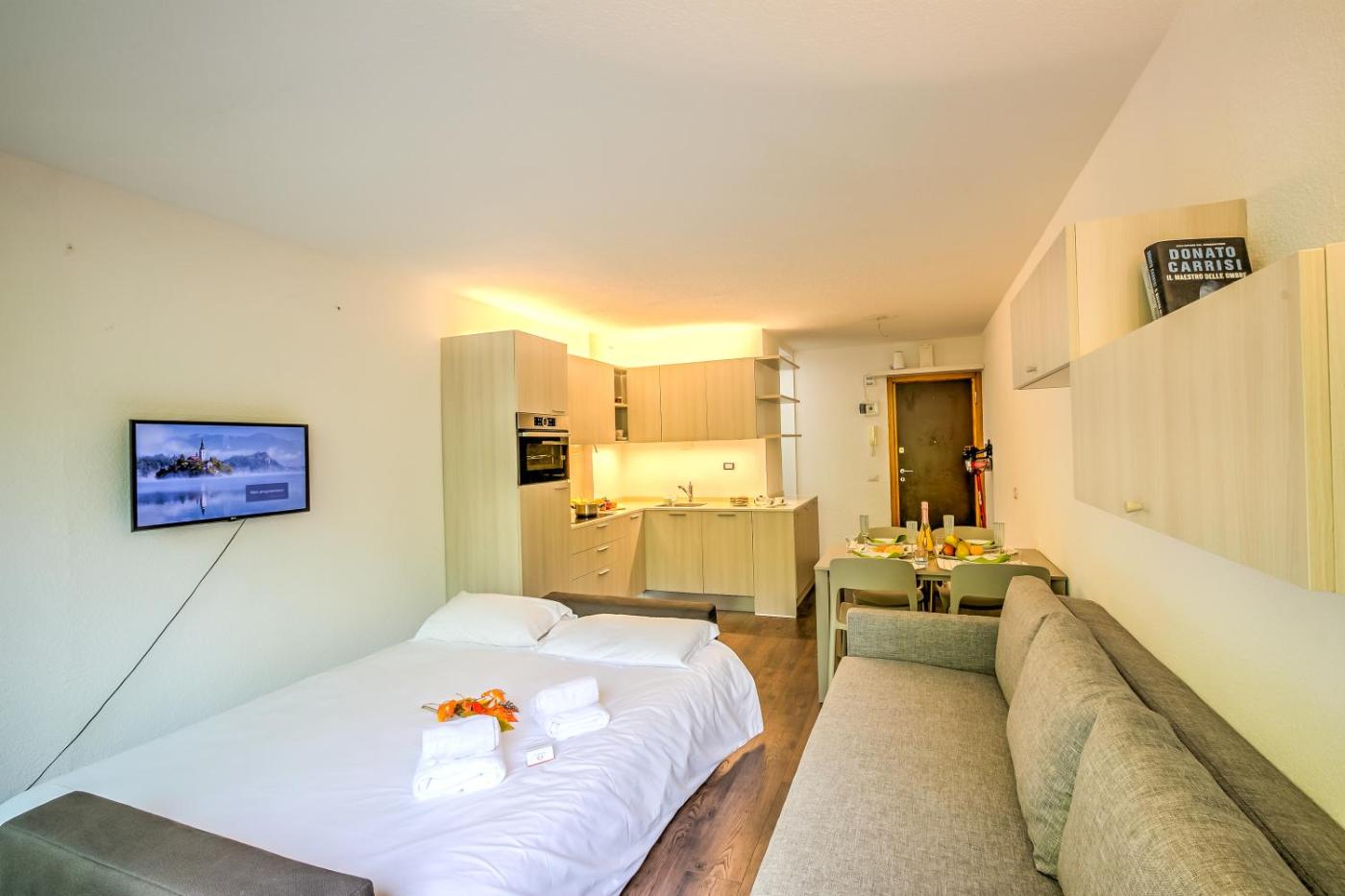 Monolocale con Balcone. The studio features a coffee machine, a seating area, as well as a private bathroom boasting a shower and a bidet. Guests can make meals in the kitchen that features a stovetop, a refrigerator, a dishwasher and kitchenware. This studio has a dining area, a wardrobe, a flat-screen TV and a balcony. The unit has 2 beds.