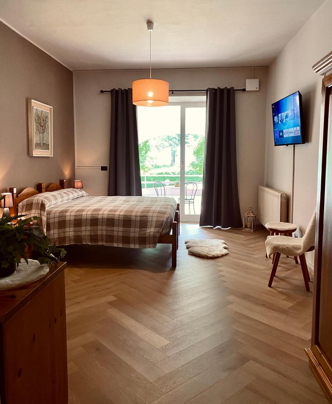 Camera Matrimoniale con Vista Montagna. Camera matrimoniale con armadio, pavimento in parquet, terrazza affacciata sul giardino e bagno privato con doccia. L’alloggio presenta 1 letto.